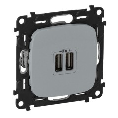 Зарядное устройство с двумя USB разъемами 100-240В~, 50-60Гц, 5В-2400мА алюминий Legrand Valena In'MaticДля быстрой зарядки мобильных телефонов, планшетов, МР3 и МР4 плееров.